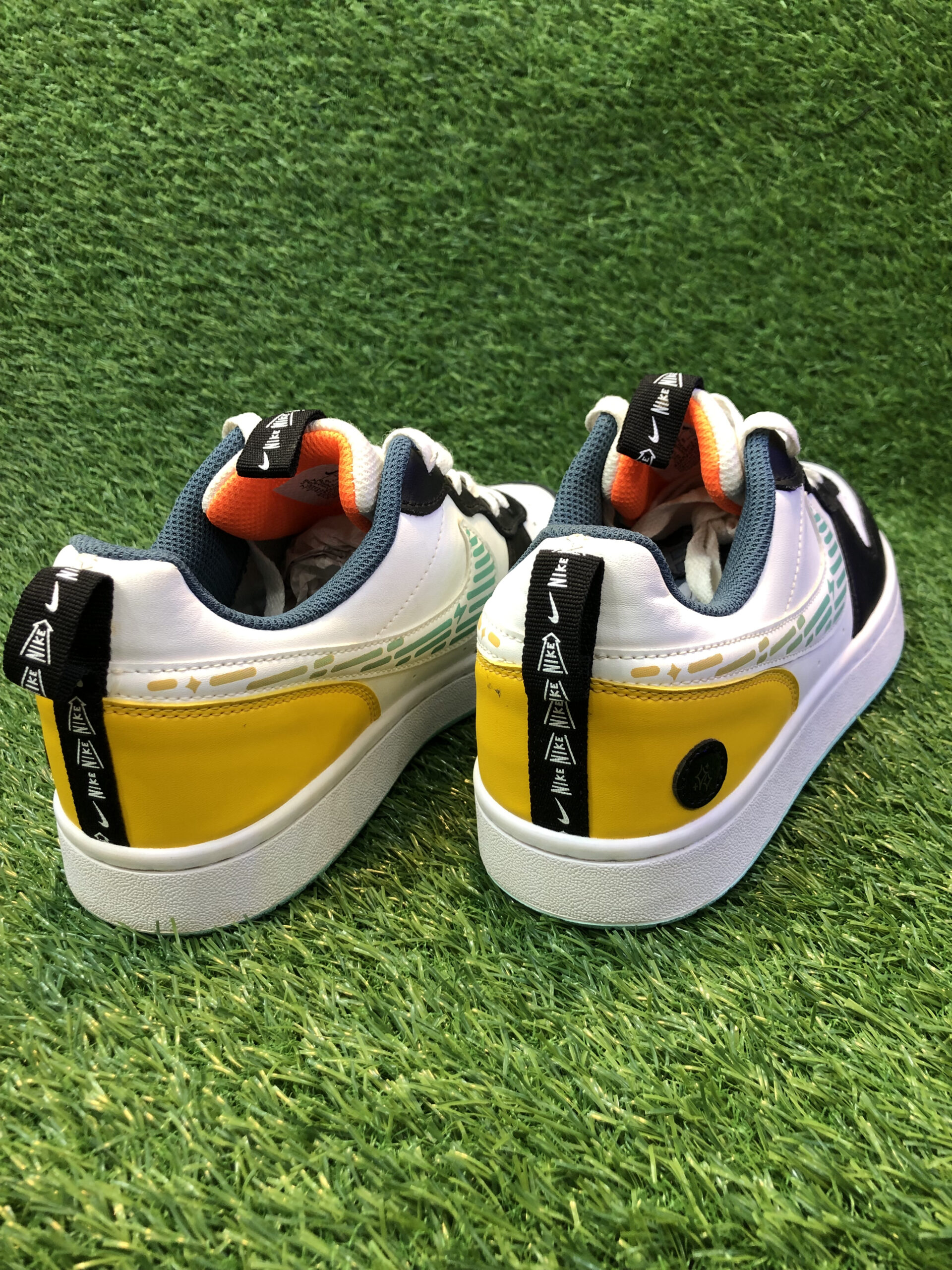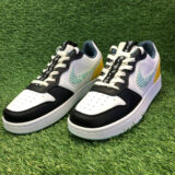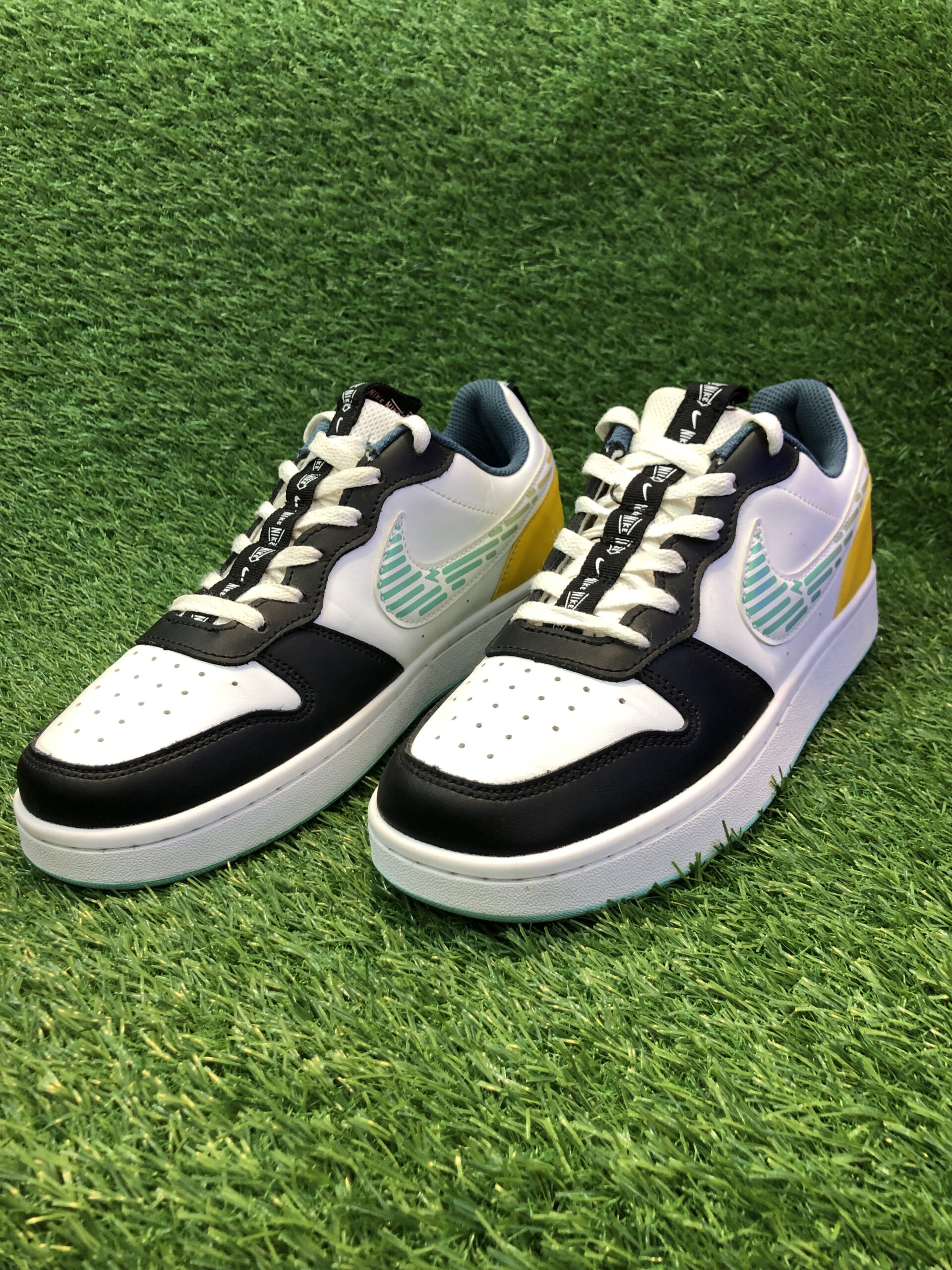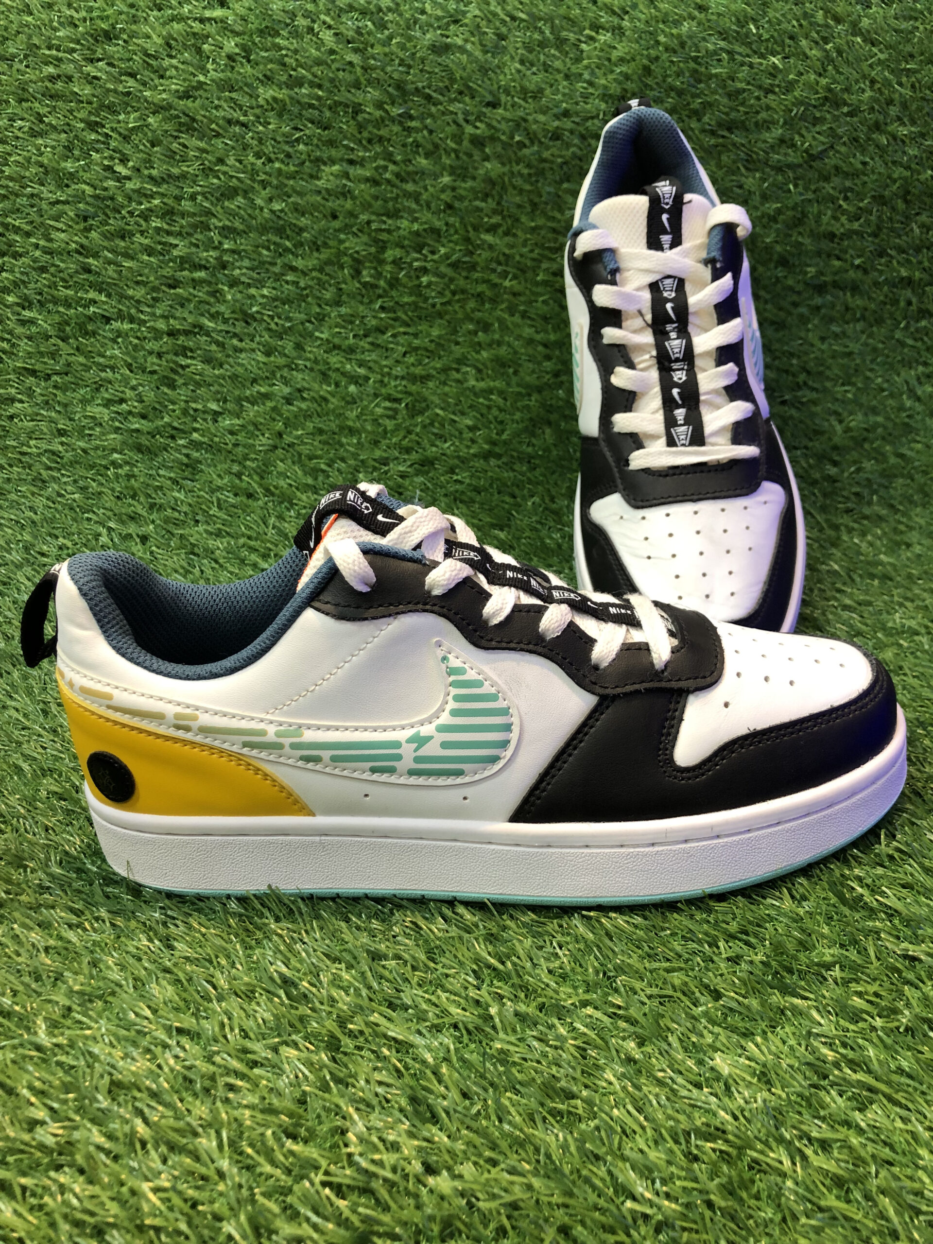 Eye-catching mix of white, navy, teal, and yellow paired with a patterned Nike Swoosh makes this sneaker a standout choice for style-savvy wearers.
